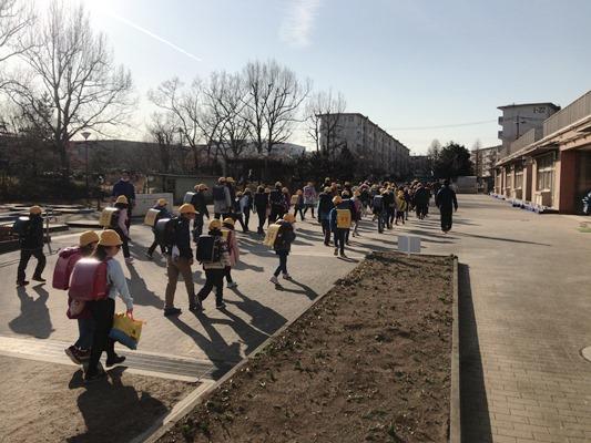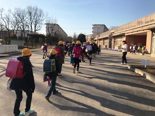 正門を出ると6年生の下校時刻で、数名の児童が帰るところでした。元気に挨拶を返してくれました。街路樹のサクラの蕾も大きく膨らんできました。6年生は、あと2日間の登校ですね。