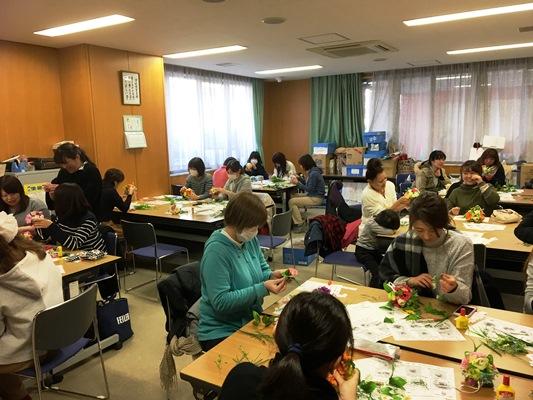 お母さん方から、糸のつけ方を学ぶ