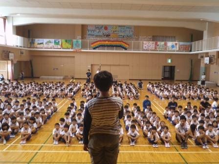 今日は、表彰朝会でした。夏休の課題の作品が多くの展覧会で入賞・表彰されました。特に3年生の小林君の作品は、「WE LOVE トンボ」絵画コンクール(全国展)で銅賞に選ばれました。夕焼け空に飛ぶトンボの群れが見事に描かれています。この作品は、昇降口に展示されていますので、ぜひご覧ください。