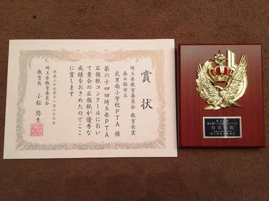 昨日、埼玉県PTA連合会広報誌コンクールの表彰式が本庄市民文化会館で行われました。本校からは、前広報委員会委員長とPTA名誉会長が出席しました。武里南小学校は、特別賞と埼玉県教育委員会教育長賞をいただきました。日頃のPTA本部・広報委員会と保護者の皆様の活動が認められました。とても名誉なことです。ありがとうございました。今後とも、武里南小学校へのご理解とご協力をよろしくお願いいたします。