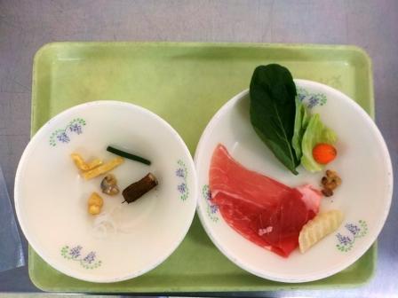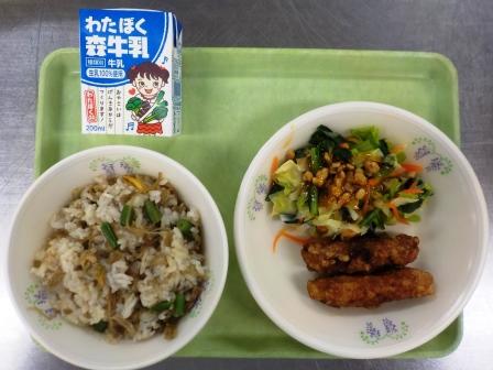 メニューは「深川めし・牛乳・ポテトの肉巻き・くるみ和え」です。