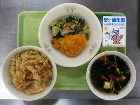 今日の給食は「こぎつねごはん・牛乳・あじフライ・