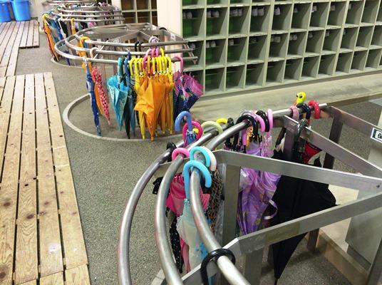 昇降口には、家に帰れない傘が置かれています。傘立てには、その日使った傘を置いてください。置き傘は、各教室に置いてあります。昇降口の傘は、その日のうちに持ち帰ってください。