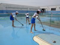 5・6年生がプール清掃を行いました。毎年高学年が清掃をしてくれています。今年度も一生懸命取り組んでくれました。6年生がプールの中を、5年生がプールサイドやトイレや更衣室、排水溝などを掃除してくれました。自分たちが汚れてしまったり、濡れてしまったとしても構わずピカピカにしてくれました。6月にプール開きをし、水泳学習を始めていきます。5・6年生に感謝して使いましょう!