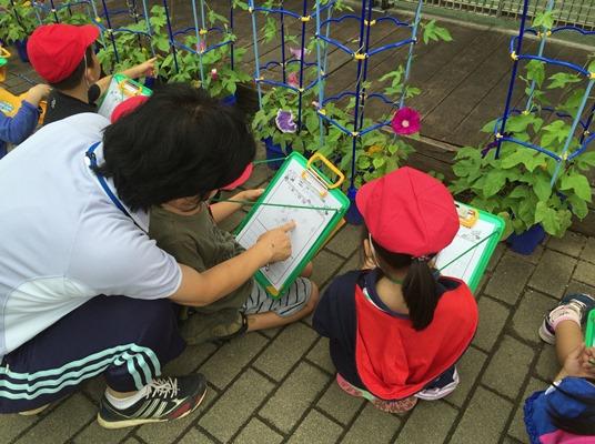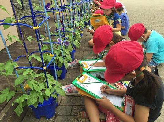 今日は、4年生の育てているヘチマに名札をつけました。ヘチマの種は、教室前のテラスで、カラスの襲撃を防ぎながら育てました。ある程度大きくなった苗を学校ファームに植え、名札をつけました。これから、どんどん大きく育ってほしいですね。