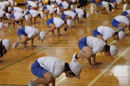準備体操の後、カエル倒立やブリッジなどを行います。