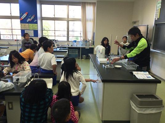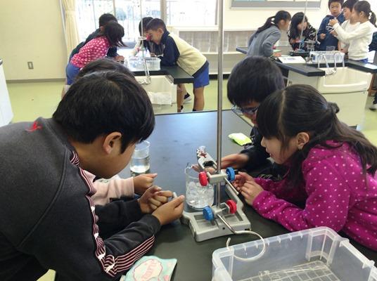 4年生が理科室で実験をしていました。空気や水が温度変化によって体積がどのように変化するかを実験によって確かめていました。石鹸水の膜が大きく膨らむのを観察して、子どもたちは「おーっ!」という歓声をあげていました。