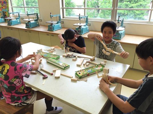 廊下にトントン金づちの音が響いてきました。図工室をのぞいてみると4年生が木と板を組み合わせて釘で止めています。子どもたちがそれぞれ作ったものを見せてくれました。キリンやヘビ、ロボット、鉄砲など・・・想像を膨らませて、うれしそうに作っています。
