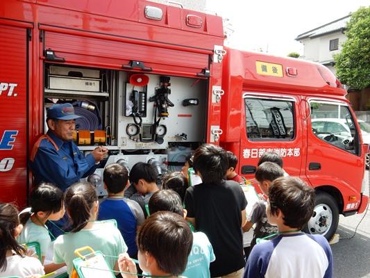 今日は、4年生の校外学習でした。春日部市消防本部備後分署行き、消防署の役割や仕事の内容をうかがってきました。大きな消防車や救急車があり、私たちの生活・安全を守ってもらっていることがわかりました。