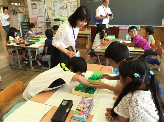 今日の給食でソラマメが出ます。朝の1年生の授業で、ソラマメのさやから豆を出すお手伝いをしてもらいました。初めての子どもたちも多く、最初は手こずっていましたが、だんだん上手になって、素早くきれいに豆を取り出すことができました。