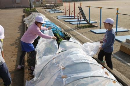 もうすぐ収穫のほうれん草、かぶ、にんじんなどを、カラスから守るためにシートをかぶせます。