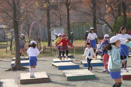 武里南小学校には、ハードルや投てき用具、鉄棒、うんてい、登り棒、8秒間走BGMなど、ローテーション運動のための環境がしっかりそろっています。のびのびといろいろな運動に挑戦できる武里南小学校で、今日も子どもたちは、元気いっぱいです。