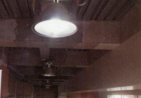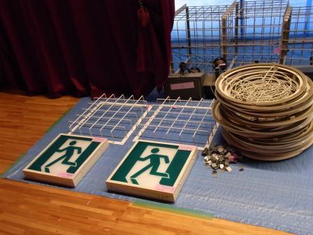 天井材をつるすボルトの穴あけや非常灯、スピーカーをつるすボルトの設置が終わりました。