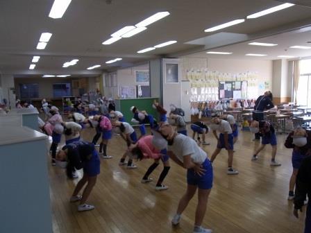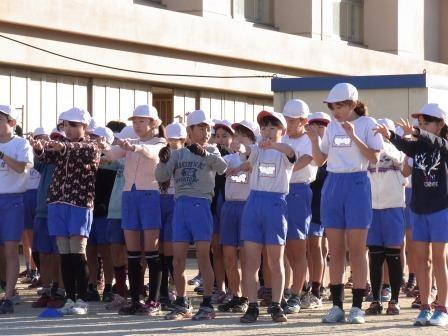 毎朝、全校朝マラソンの前に、音楽に合わせて、