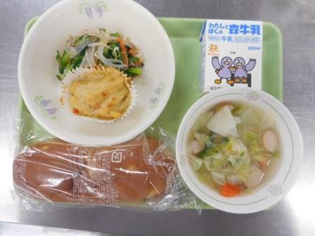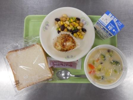 今日の給食のメニューは「食パン、いちごジャム・牛乳・