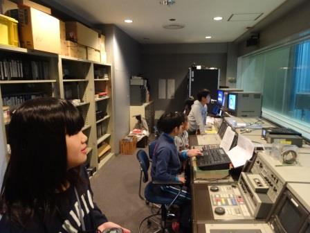 TV番組製作体験では、調整室で、ディレクター、ミキサー、タイムキーパー、テロップなどを、