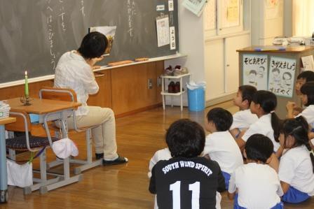 今朝の読書タイムは、1、2年生のクラスに、春日部おはなしの会の方が来てくださり、