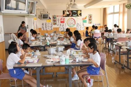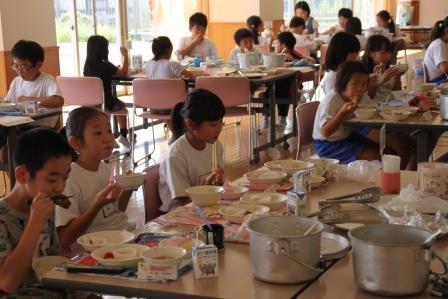 いつもと違う顔ぶれといつもより広いランチルームで食べる給食は、いつもと一味違っています。