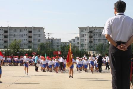広い校庭で、縦と横をそろえ、手と足を大きく動かして行進します。
