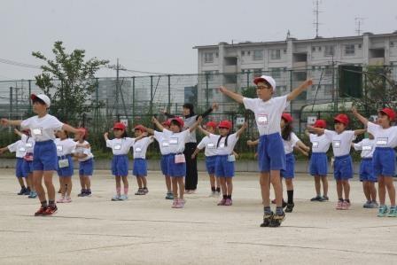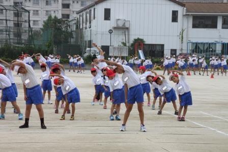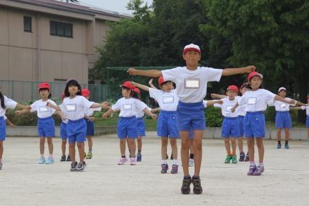 1年生も、高学年の動きに合わせて、一生懸命に、大きくしっかりと体操を行っています。