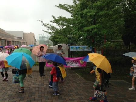 今朝も、梅雨空の雨の降る中を、PTAの皆様による朝のあいさつ運動です。