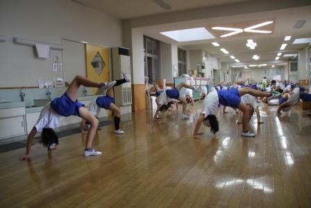 ラジオ体操で準備運動を行った後、カエル倒立やブリッジなどを行い、バランス感覚や柔軟性を高めます。