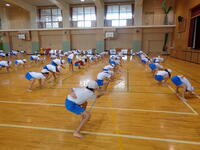 体育館から迫力のある音が聞こえてきました。34年生が運動会の表現練習を行っていました。見本になる児童が前に立ち、腰を低く構えています。今年の演目は「ソーラン節」です。運動会での定番演目ですので保護者の方も踊ったことがある方がいらっしゃるかもしれません。ぜひお家で一緒に練習してみてください。