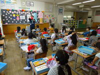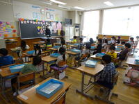 今日も1年生は簡易給食です。牛乳とパンを食べました。給食当番も頑張りました。