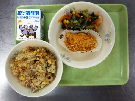 今日の給食のメニューは「れんこんピラフ・牛乳・