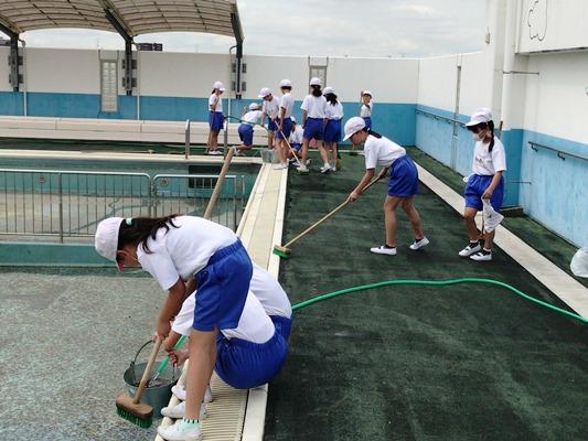 プール掃除 投稿日時 : 2017/05/24 武里南小 カテゴリ: プールサイドを掃除する5年生デッキブラシで掃除する児童 今日は、5年生、6年生がプール清掃をしました。使わない間にプールはかなり汚れていました。5年生、6年生が必死になって掃除をして見違えるようになりました。