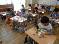1年生が育てたアサガオの花を使ってたたき染めをしていました。花の色も一人一人違うので、色とりどりの作品を制作していました。染めた紙に虫をかく子、人をかく子、お花をかく子など様々です。素敵な作品を作ることができましたね!!