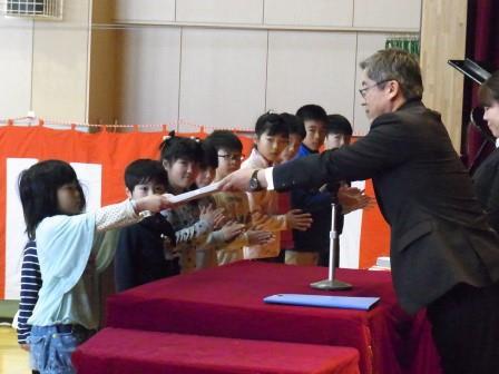 各学年の代表児童が、修了証書と進級祝いを受け取りました。
