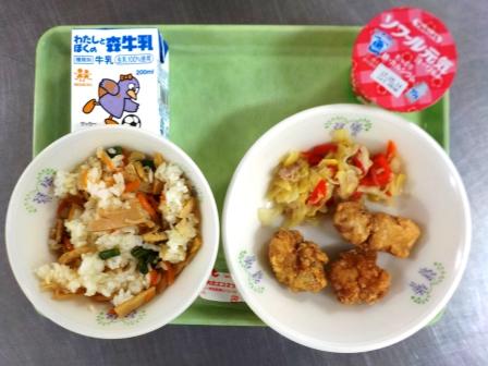 今日の給食紹介 投稿日時 : 2017/04/27 武里南小 カテゴリ: 今日の給食の食材ですどんなメニューになるのでしょうか。 今日の献立は「たけのこごはん・牛乳・とり肉のから揚げ・野菜ソテー・ヨーグルト」です。