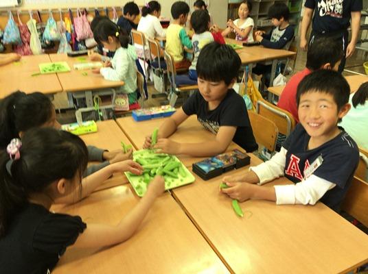 今日は、3年生が学活の時間にエンドウ豆について学び、グリンピースをさやから取り出すお手伝いをしました。エンドウ豆は古くは、古代エジプト時代に食料として利用され、かのツタンカーメン王のお墓から豪華な装飾品とともに出土しています。日本には江戸時代にヨーロッパからもたらされたそうです。そんな食べ物の歴史を調べてみると楽しいですね。