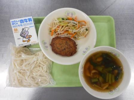 今日の給食の献立は「地粉うどん・牛乳・手作り