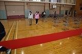 初めにモップがけ、その後に赤いジュータンを引き、いすを並べ、紅白幕を張りました。
