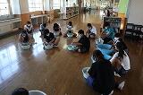 全体練習で着ていた体操着を選択しました。たらいに水を張り、石鹸を入れて手洗い開始。なかなか難しいようです。体操着を絞ることに四苦八苦していました。洗濯機のありがたさがよくわかったようです。