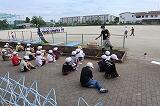 2年生は生活科で野菜を育てます。そこで、校務員の斎藤さんに指導を受けながら、畑に種を植えました。