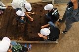 指導者の話を聞く2年生 大根の種まき みんなで分担して種まき