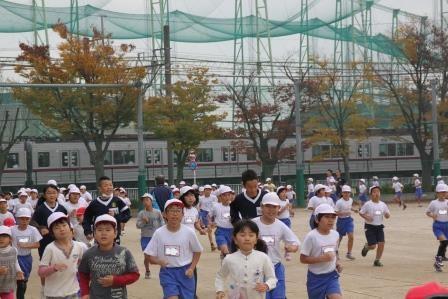 朝、全校児童に自己紹介した後、早速、全校朝マラソンに、武里南小の子どもたちと一緒に取り組みました。