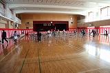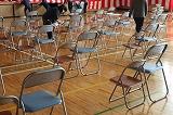 体育館の会場準備や教科書・プリントの袋詰めなどの作業をしています。教室の机・いすや体育館のいすなどをアルコール消毒したり、いすの間隔を離すなど感染防止には十分気を付けて、1年生の入学を待っています。