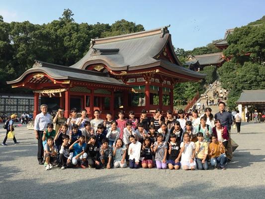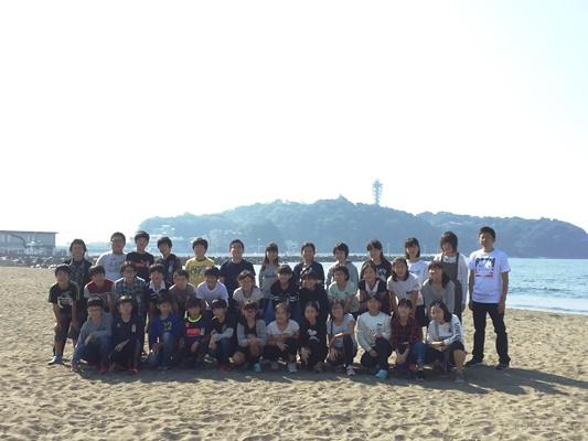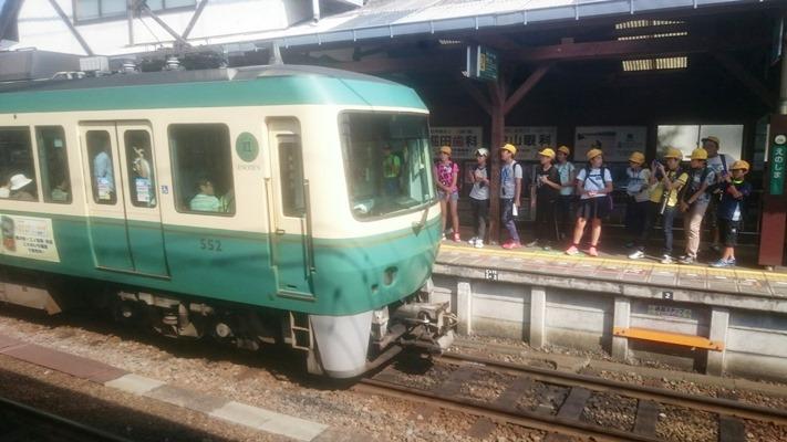 江ノ島水族館前で、江ノ島をバックに記念写真を撮りました。江ノ島から鎌倉に電車で移動します。