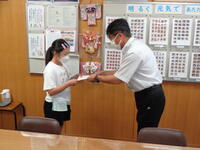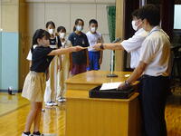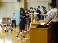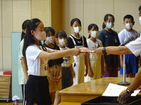 11日(月)に表彰朝会を行いました。今回は先日行われた硬筆と陸上競技大会の表彰です。硬筆では、市内硬筆展、県中央展覧会の表彰です。代表として2名の児童が登壇しました。市内陸上競技大会では、入賞した21名の表彰を行いました。硬筆展も陸上競技大会もどちらも大変立派な態度で臨むことができました。表彰されたみなさん、おめでとうございます。