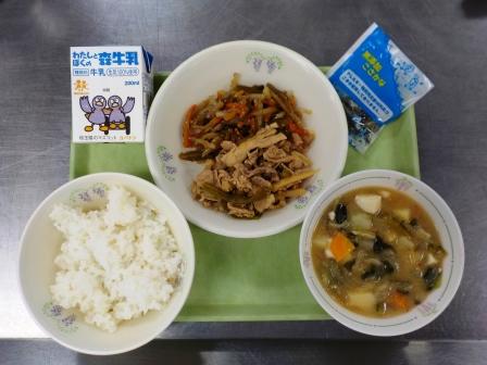 「ごはん・牛乳・ぶた肉の生姜焼き・くきわかめの炒め物