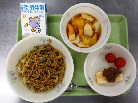 今日の献立は「焼きそば・牛乳・いかのピリ辛焼き・