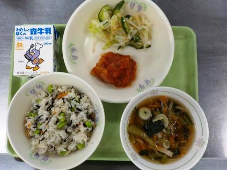 今日の献立は「枝豆ごはん・牛乳・鶏肉の