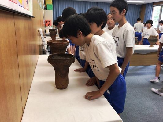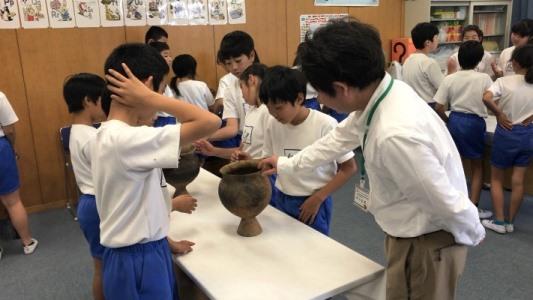 今日は、5年生が「古代から教室へのメッセージ」ということで、埼玉県埋蔵文化財事業調査団の方から、縄文、弥生、古墳時代の土器を見せていただき、授業をしていただきました。子どもたちは、触ったり、持ち上げたり、古代の人たちがどのように土器を使っていたのか考えていました。古代の人々の生活を考える1時間となりました。