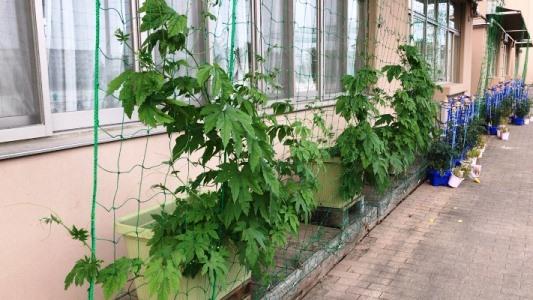 栽培委員が育てている緑のカーテン(ゴーヤ)が勢いを増して育っています。梅雨明けには、夏の日差しを遮ってくれるでしょう。