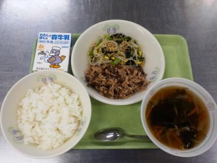 今日の献立は「ごはん・牛乳・ビビンバ(肉、野菜)