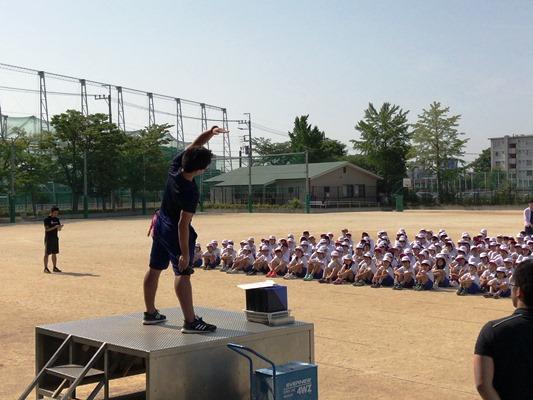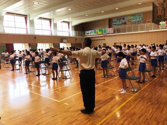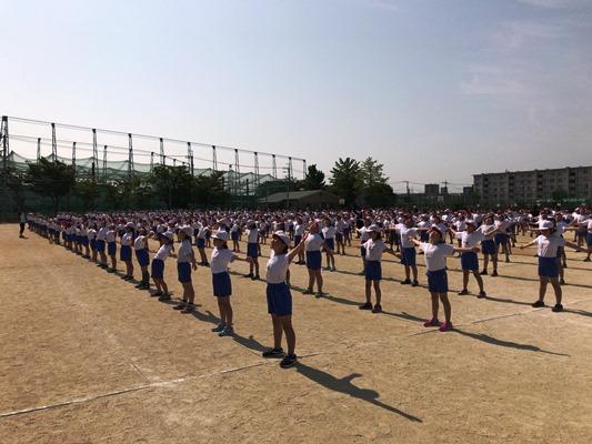 今朝は、体育朝会がありました。全校そろってラジオ体操第一を行いました。低学年の児童は、まだ慣れていないのでぎこちないのですが、一生懸命にやろうとする態度は良かったですよ。